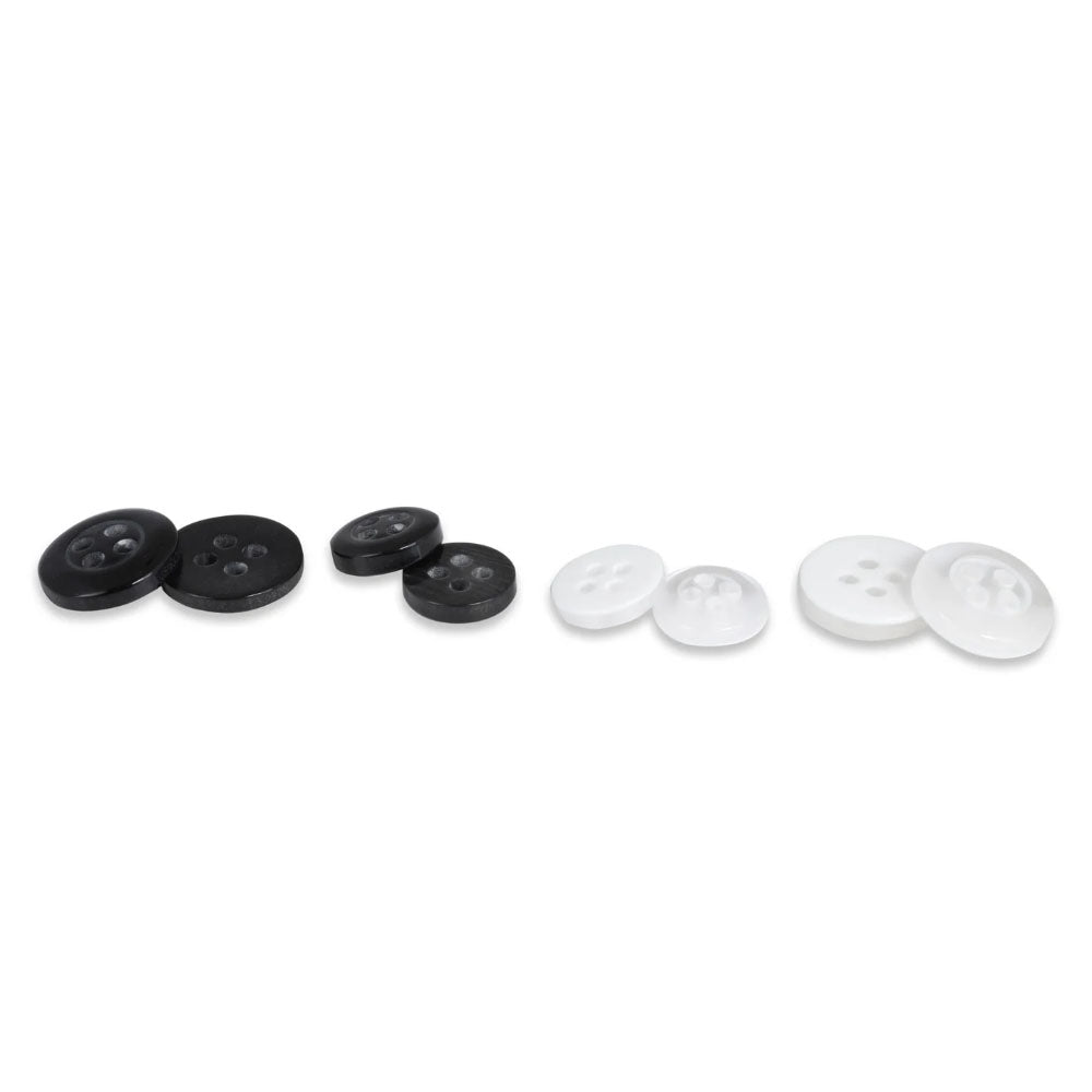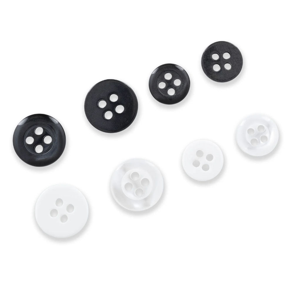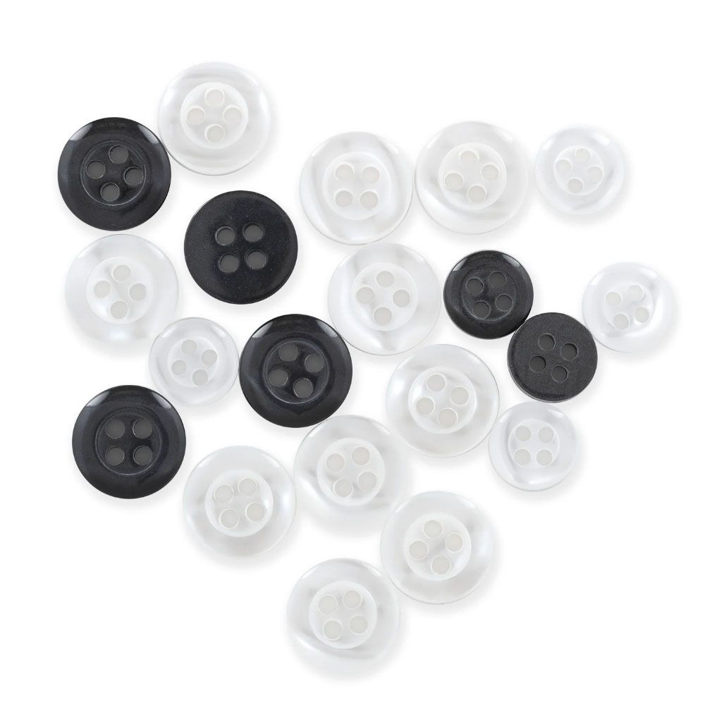 Dritz, Assorted Shirt Buttons are perfect for keeping on hand for emergencies. This assorted package contains two standard sizes for replacing buttons on shirts, collars, cuffs, dresses, and other apparel. These Dritz, Assorted Shirt Buttons feature white pearl and black anthracite buttons with four sewing holes and are washer safe.