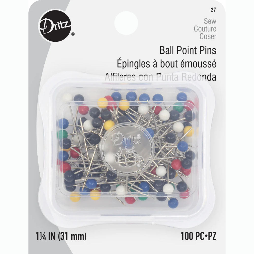 Dritz's Ball Point Pins feature a rounded tip specifically designed for knit fabrics. These nickel-plated steel straight pins feature multi-colored heads and a 0.5mm extra-fine shaft. This 100-pack comes in a reusable plastic storage box with a curved side for easy pin removal.