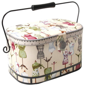 Lovely dress forms decorate this oval-shaped sewing basket accented with a tape measure trim and complete with a curvy black handle.