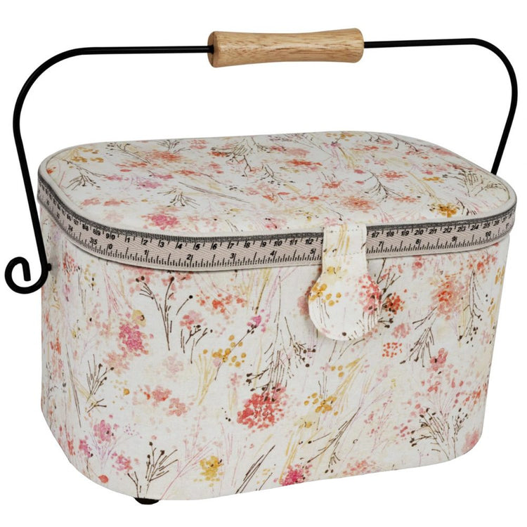 Enchanting floral spray patterns in pale colors with a hint of gold adorn this oval-shaped sewing basket accented with a tape measure trim and complete with a curvy black handle.