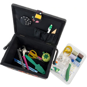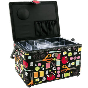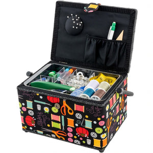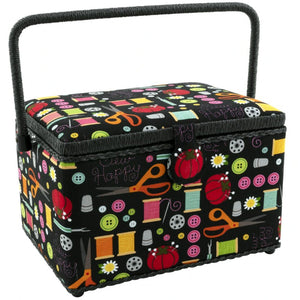 The Dritz Sewing Baskets are stylish and conveniently portable for keeping and organizing your go-to sewing, quilting, or crafting supplies. Whether at home or on the go, these baskets are the perfect size for keeping supplies on hand! This Dritz Large Sewing Basket features multi-colored sewing notions against a black background with coordinating black trim, handle, and lining. These baskets make an cheery addition to any sewing space! Notions pictured are not included.