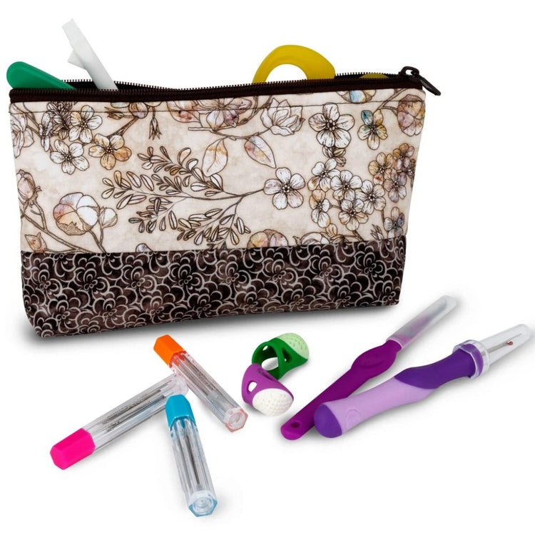 The Dritz Sewing Baskets are stylish and conveniently portable for keeping and organizing your go-to sewing, quilting, or crafting supplies. Whether at home or on the go, these baskets are the perfect size for keeping supplies on hand! This Dritz Medium Sewing Basket features a soft, neutral-colored floral print with accenting brown handle, and lining. The included coordinating zippered accessory case keeps your most essential items readily available. These baskets make a fabulous addition to any sewing space!
