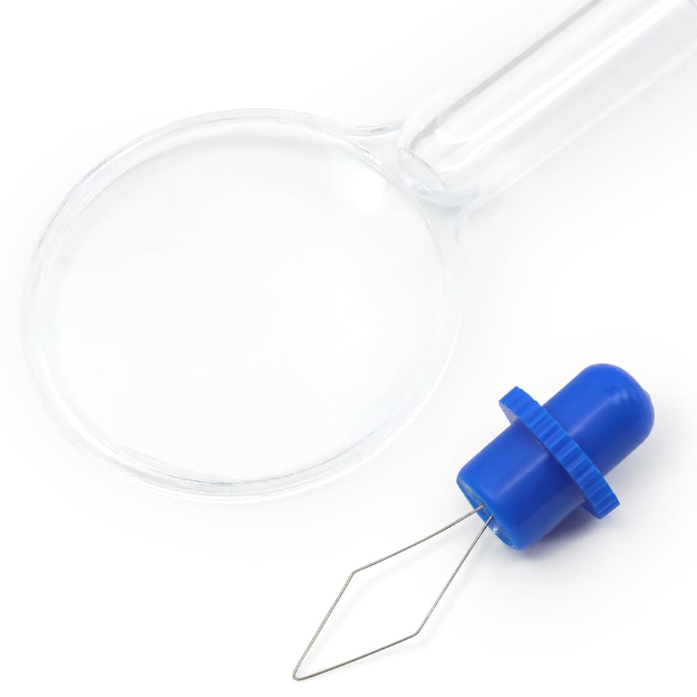 Easily and quickly thread your needle with the help of Dritz's Needle Threader and Magnifier. This convenient little tool threads most hand and machine needles with ease. Plus, you don't have to strain your eyes to get your needle threaded with the magnifier.