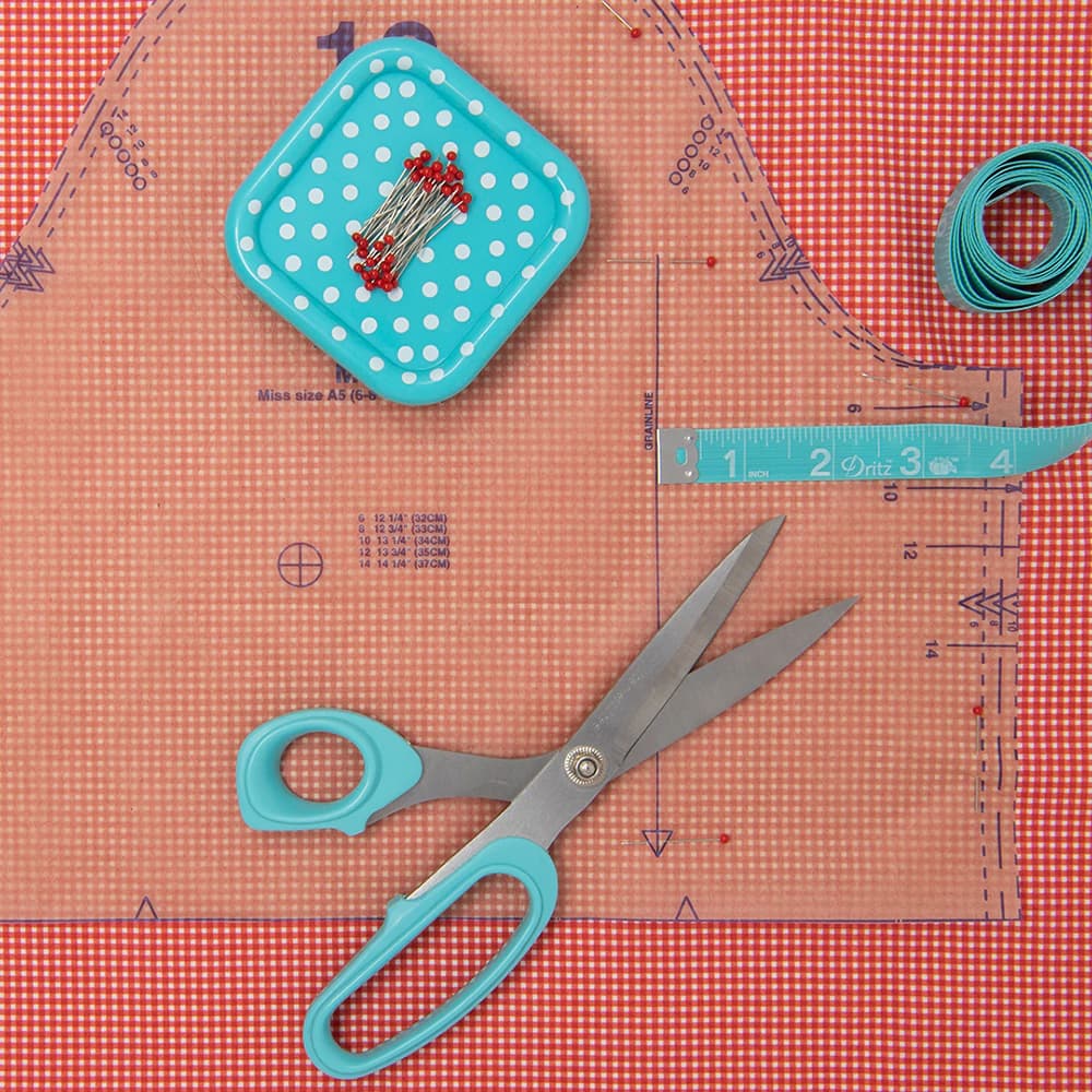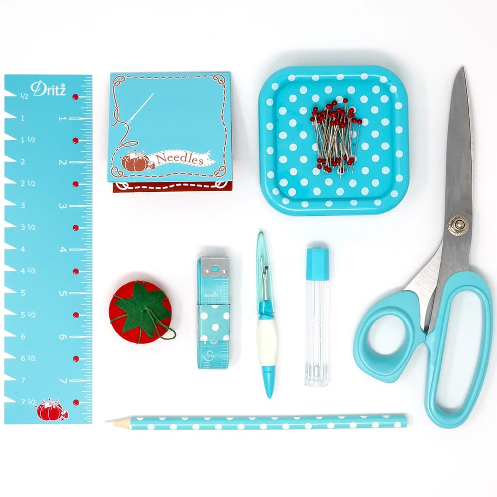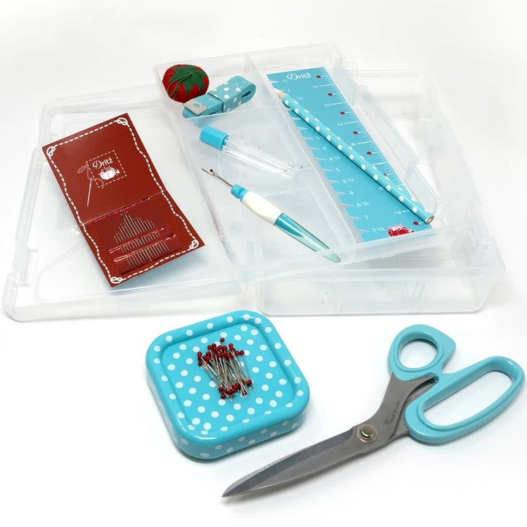Dritz's Sewing Box Kit includes all the basics that a beginner or a seasoned sewist might need. The Sewing Box Kit consists of a removable four-compartment tray that holds 8-1/2" shears, pin magnets, 45 red glass head pins, a small ergonomic seam ripper, 15 hand needles, needle storage tube, 60" measuring tape, 2" x 8" ruler, white marking pencil, and a cherry tomato pin cushion. The Dritz Sewing Box Kit makes the perfect travel-sized companion for sewist on the go.