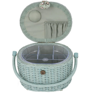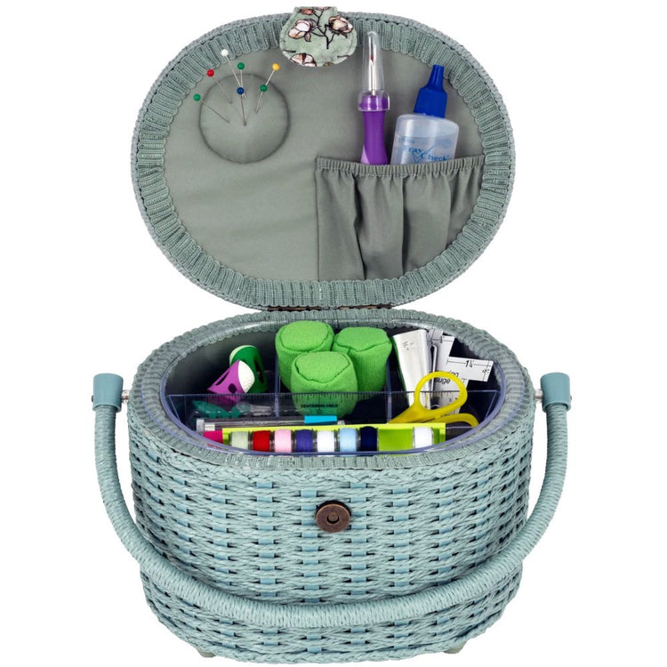 The Dritz Sewing Baskets are stylish and conveniently portable for keeping and organizing your go-to sewing, quilting, or crafting supplies. Whether at home or on the go, these baskets are the perfect size for keeping supplies on hand! This Dritz Small Woven Sewing Basket is a soft green with an accenting floral print and coordinating green trim, handle, and lining. These baskets make an adorable addition to any sewing space!
