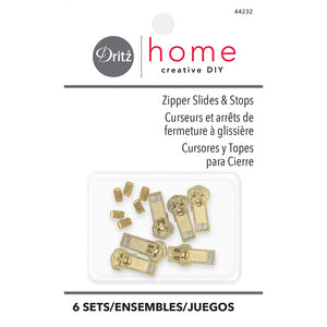 Dritz Zipper Slides and Stops allow you to customize your zipper. Shorten any zipper and add a new stop. Dritz Zipper Slides and Stops are perfect for upholstery projects. Each package of Dritz Zipper Slides and Stops contains six slides (also called zipper pulls) and six stops. Color: Brass.