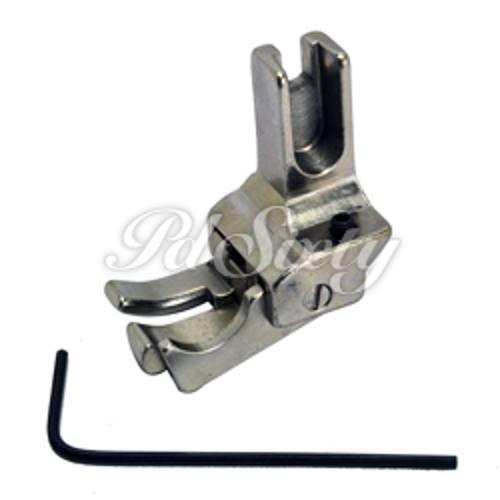 The double compensating foot is used for uniform and precise top stitching. This foot can be used for both right and left top stitching. The edge guide is spring loaded to compensate for different thickness of fabric.