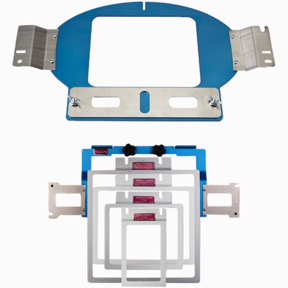 This Durkee/Baby Lock Exclusive Alliance Hoop Set includes 1 Cap Frame, the EZ Frame Blue Attachment Arm, and a 4-piece combo package. To use these frames, apply a self-adhesive backing to the underside of the frame and "float" your material on top. Every EZ Frame has alignment guides on each side for easy centering.