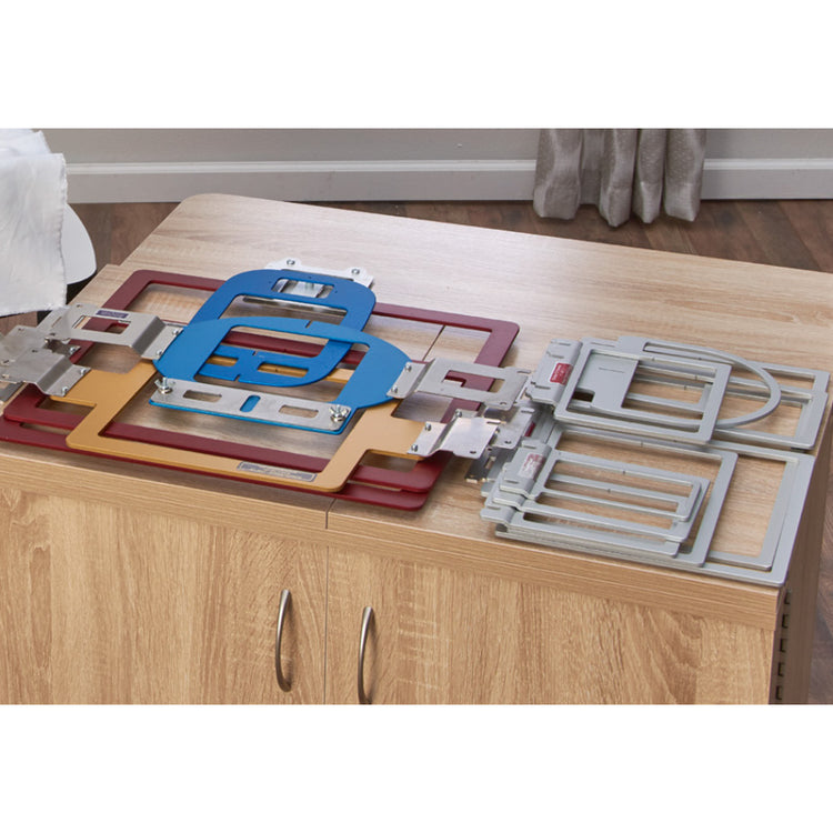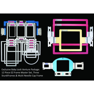 This Durkee/Baby Lock Exclusive Venture Hoop Set includes the 12-piece EZ Frames Master Set, 3 SturdiFrames, and a Multi-Needle Cap Frame. To use these frames, apply a self-adhesive backing to the underside of the frame and "float" your material on top. Every EZ Frame has alignment guides on each side for easy centering.