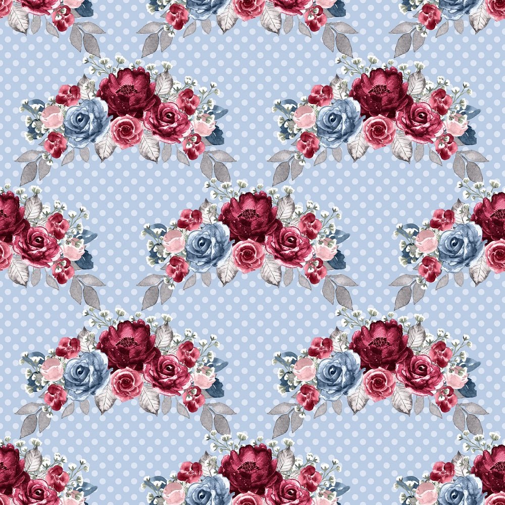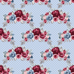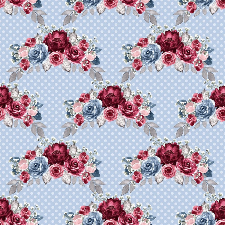 The Blue Dusty Blue and Burgundy Bouquets Dots Fabric is part of the Dusty Blue and Burgundy Fabric Collection printed by Sew Creative Fabrics. Digitally Printed on 100% cotton.