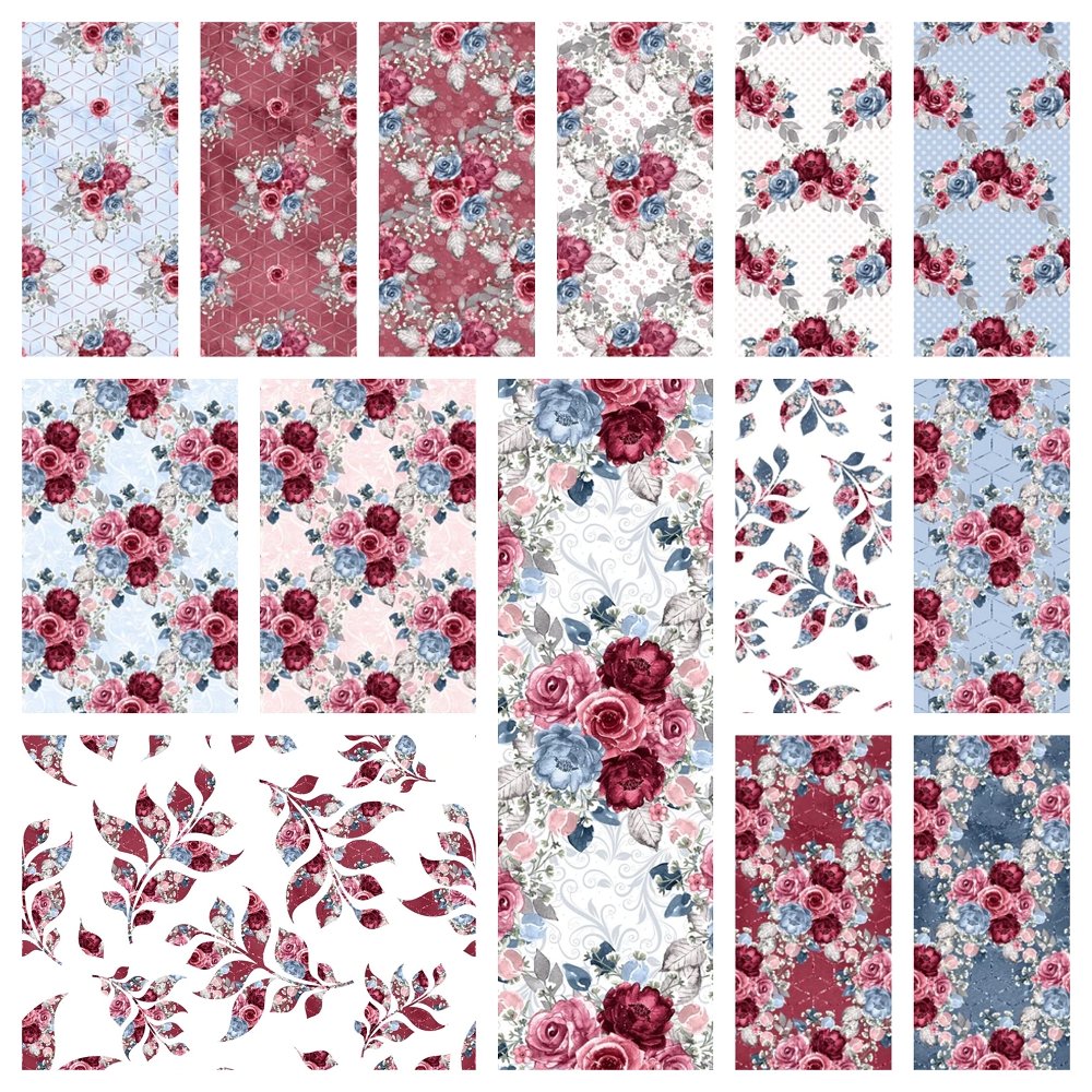 Dusty Blue and Burgundy Fabric Collection Bundle - 14 Pieces Details
