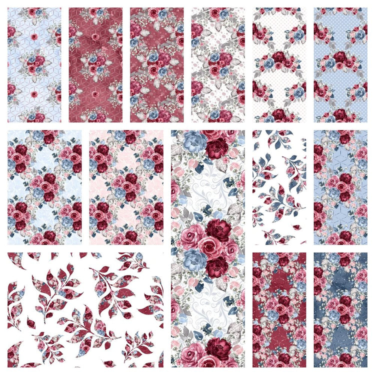 Dusty Blue and Burgundy Fabric Collection Bundle - 14 Pieces