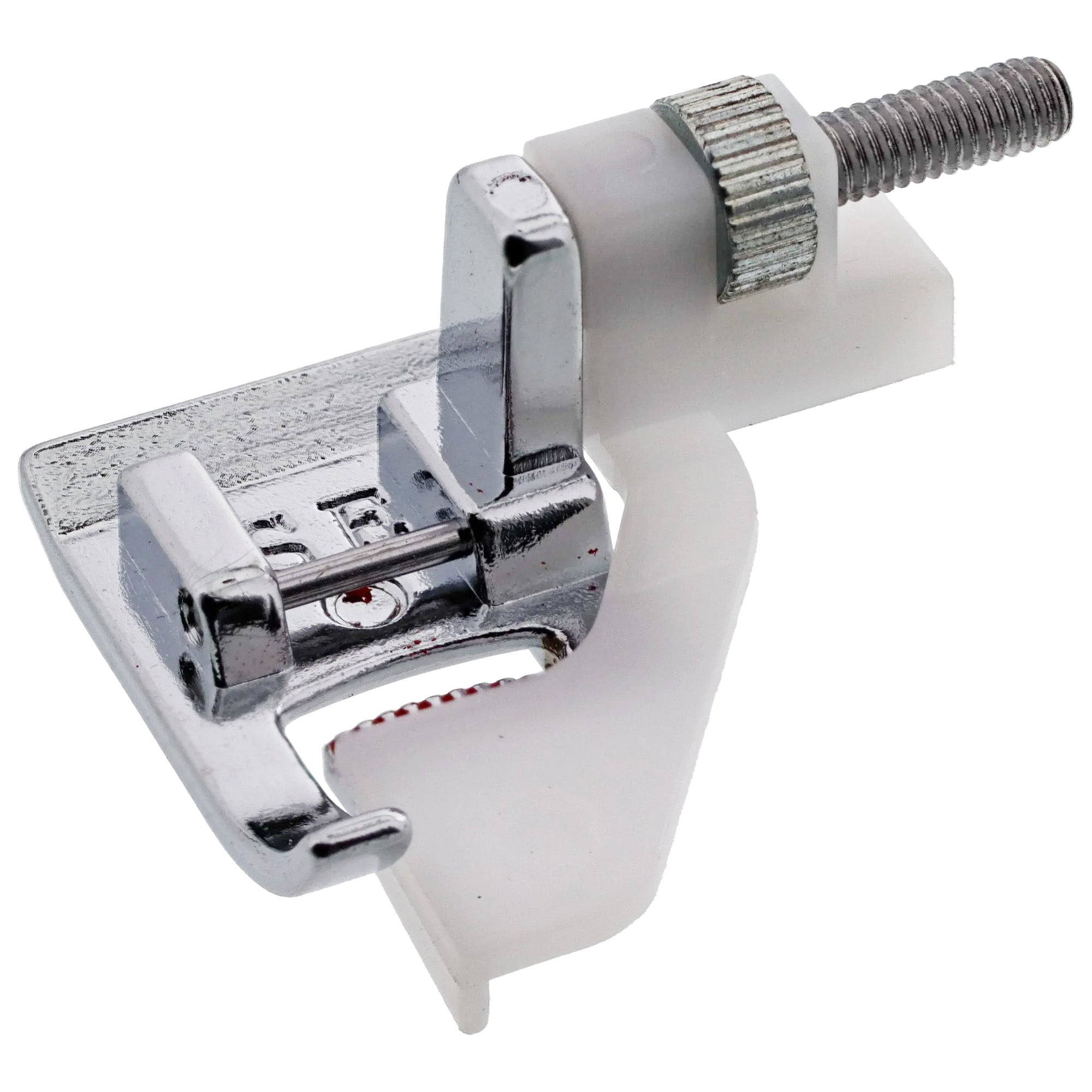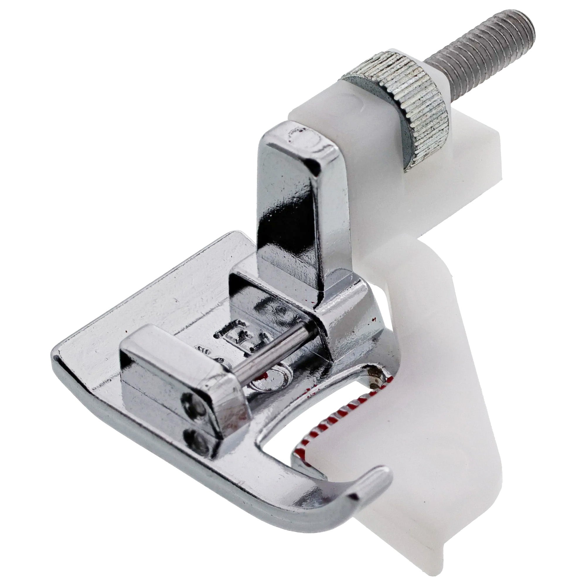 The Edge Stitch Foot guides topstitching and edge stitching perfectly. The guide of this foot aligns the edges/seams of the fabric to achieve ease. To adjust the foot, turn the screw to match the edge/seam precisely. This foot is also perfect for creating tucks, hems, and fine-edge projects using fabric like lace or ribbon for a nice decorative edge.
