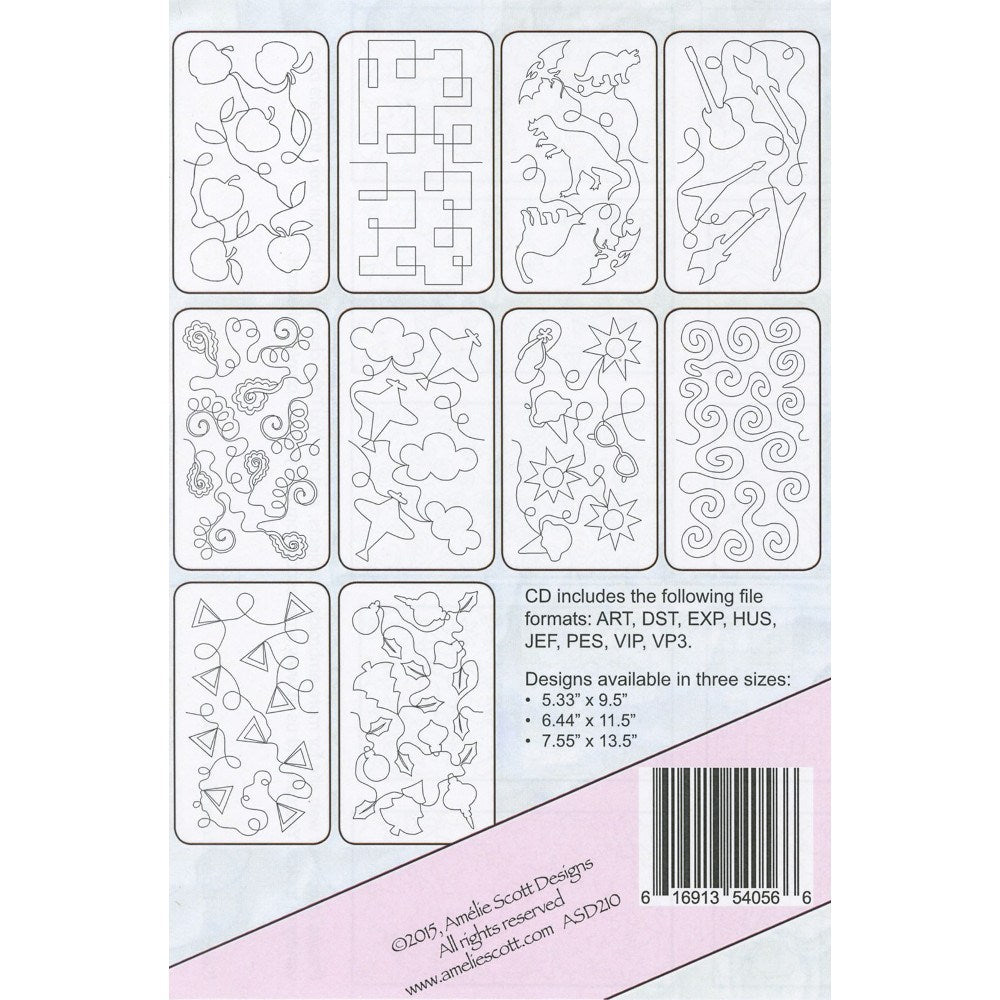 The Edge-to-Edge Expansion Pack 3 Pattern and Embroidery CD works hand-in-hand with the Edge-to-Edge on your Embroidery Machine Pattern and CD. The Expansion Pack 3 includes 10 new quilting designs that work with the quilting techniques from the original book. The Edge to Edge Expansion Pack 3 allows you to use your home embroidery machine to professionally finish quilts; as if they were longarm quilted. All 10 files are available in three sizes: 5.33in by 9.5in, 6.44in by 11.5in, 7.55in by 13.5in. Embroidery file formats include: ART, DST, EXP, HUS, JEF, PES, VIP, VP3.