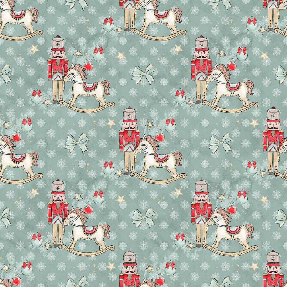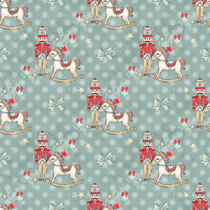 Elegant Nutcracker Next to Rocking Horse Snowflakes Fabric - Green Details