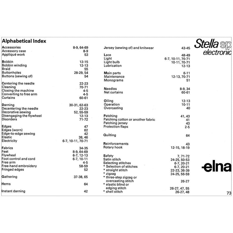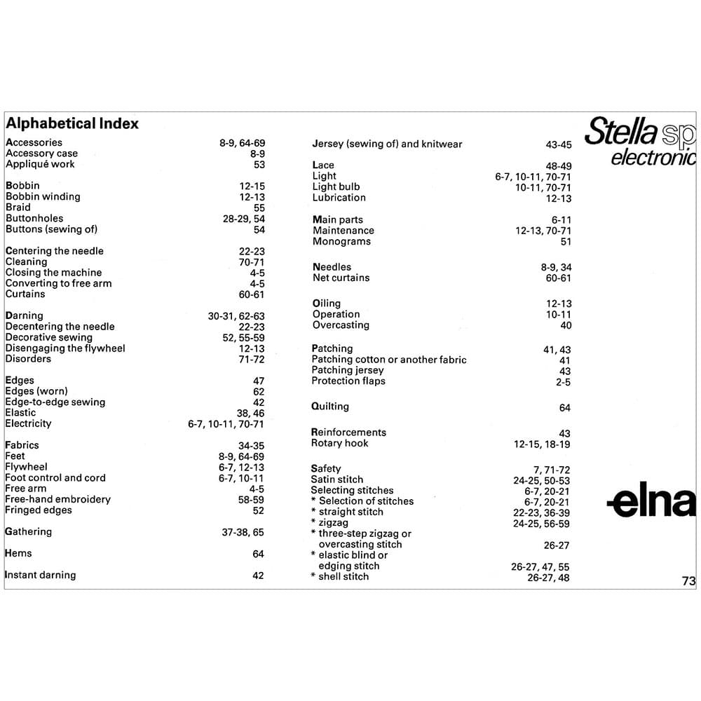Elna 27 Stella Series Sewing Machine Instruction Manual (Model 27) - 76 Pages. Lost your sewing machine's manual? We've got you covered! This instruction manual is the ultimate guide to unlock the full potential of your Elna 27 Stella Series. No more confusion or frustration—just clear, concise instructions right at your fingertips. What's inside? Everything you need to know from setting up to mastering your sewing machine and all its features.