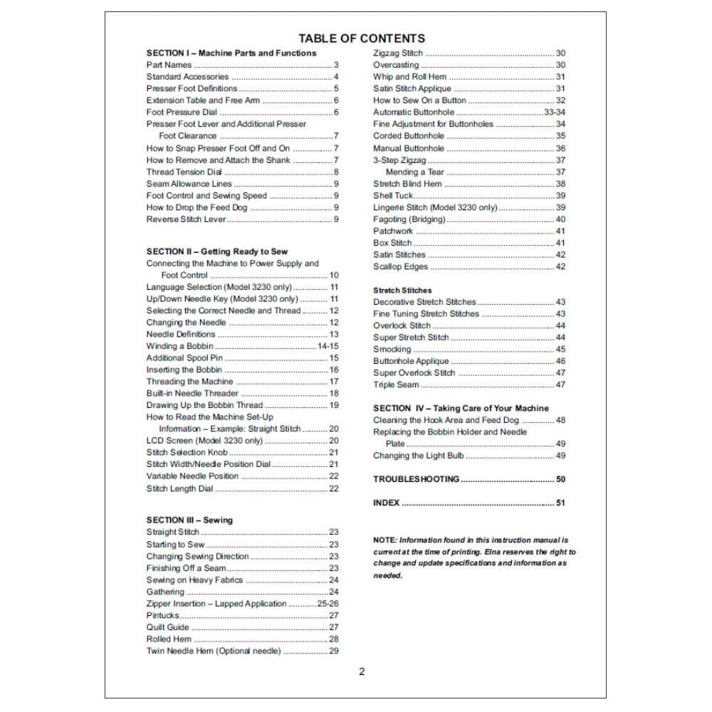 Elna 3230 Sewing Machine Instruction Manual (Model 3230) - 52 Pages. Lost your sewing machine's manual? We've got you covered! This instruction manual is the ultimate guide to unlock the full potential of your Elna 3230. No more confusion or frustration—just clear, concise instructions right at your fingertips. What's inside? Everything you need to know from setting up to mastering your sewing machine and all its features.