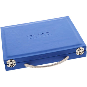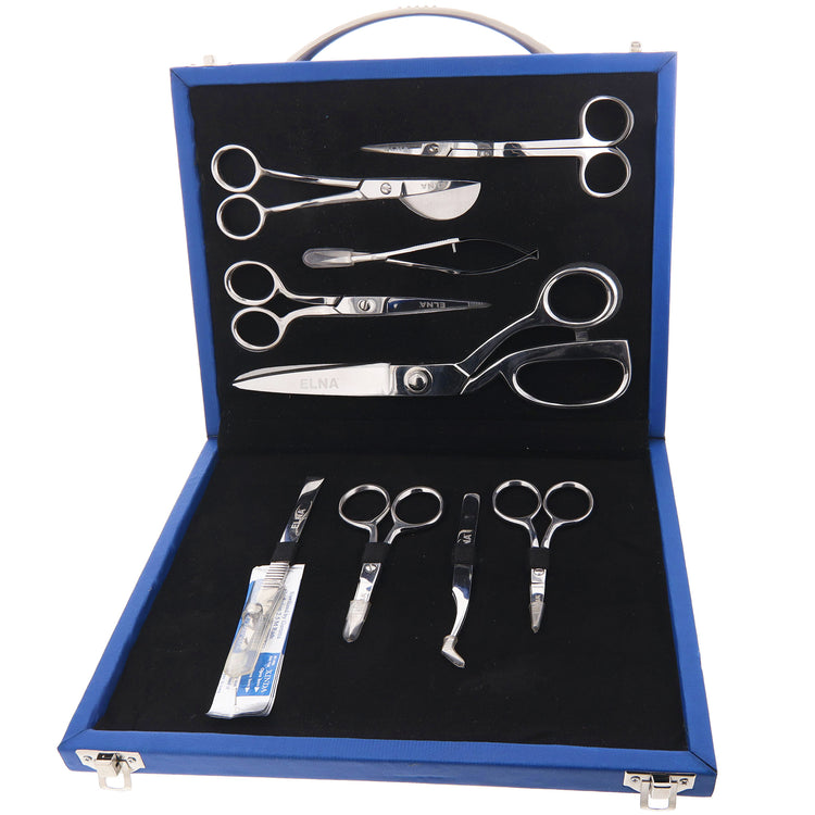 The Elna 9-piece Sewing & Embroidery Scissors Kit is a comprehensive set designed for precision and versatility in any sewing or embroidery project. This kit includes a variety of scissors, from sharp and fine-tipped embroidery scissors to larger, heavy-duty fabric shears, catering to different cutting needs. Each pair is crafted from high-quality stainless steel, ensuring durability and a clean, precise cut every time. With ergonomic handles, these scissors provide comfort during extended use, reducing hand fatigue. Ideal for both beginners and seasoned sewists, the Elna kit is an essential addition to any sewing toolbox, offering a perfect blend of functionality and style. Best of all, these scissors come in a blue leather storage box with Elna embossed on the top and silver hardware.