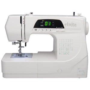 The Elnita ec30 is a great machine for those looking to upgrade from their mechanical machine to a computerized one. This compact machine offers 30 stitches, a one-step buttonhole, a free arm, and more. By the screen, you'll find convenience buttons for easy sewing, including a locking stitch button, easy reverse button, and needle up/down button. With all the features packed into this machine and its affordable price, beginners and professionals will love the ec30.