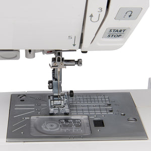 Equipped with convenient one-touch buttons, you will find the following options along the front of the machine: needle up/down, automatic thread cutter, lock stitch, start/stop, speed control slider, reverse stitch. With these buttons, you can raise or lower the needle, prevent your stitches from coming undone, use them in place of a foot control, and much more.