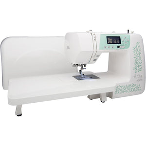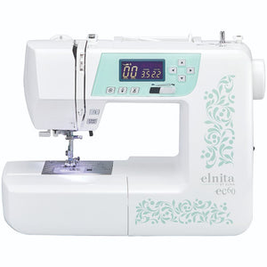 The Elnita ec60 from Elna is a full-featured computerized sewing machine that was designed with a quilter's needs in mind. This mighty machine is suitable for multiple applications and purposes. This stylish, compact machine comes packed with all the essentials you will need, like 60 built-in stitches (including six 1-step buttonholes), 7-piece feed dogs, needle up/down, lock stitch, a built-in needle threader, presser foot recommendations, and much more. The exclusive feeding system assures even feeding on all fabric types and thicknesses. Weighing just over 12 pounds, the ec60 is the perfect size to take with you when traveling or going to guild meetings and classes. The included extension table makes large quilting projects a breeze. With all the features packed into this machine and its affordable price, beginners and professionals will love the ec60.