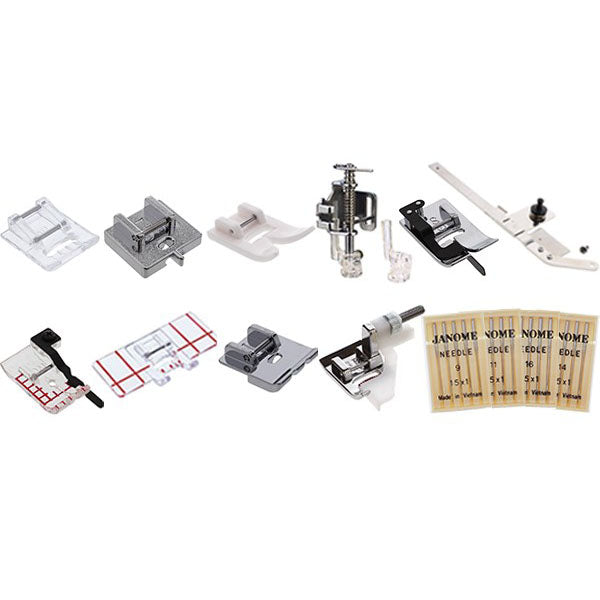 Get all the feet you need to succeed on your new 720 Pro with this FREE bonus bundle. This 14-piece bundle allows you to tackle most projects with ease. It includes a border guide foot, 1/4" clear view foot with guide, ditch quilting foot, free motion couching foot, ultra glide foot, concealed zipper foot, circular sewing attachment, applique foot, piping foot, edge guide foot, and four packs of Janome needles (100/16, 90/14, 80/12, 75/11).