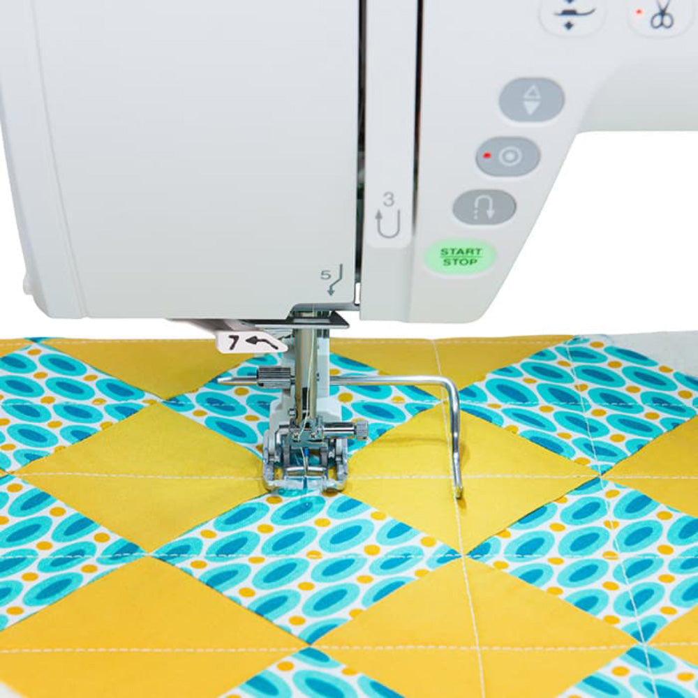 The Elna eXcellence 770 Sewing Machine offers an incredibly accommodating sewing space. With 11” to the right of the needle and 15 ½” total work area, the extra space and ergonomic design allow for more quilt room. Plus, a detachable extension table that doubles as accessory storage can be removed to expose the free arm for sewing sleeves, waistbands, or pant legs.