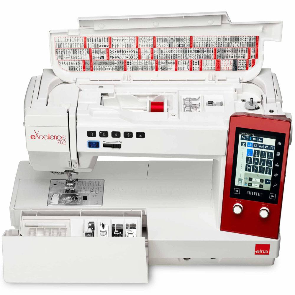 Elevate your quilting to a whole new level with the combination of advanced features and user-friendly technology. The opportunities to showcase your creativity are infinite on the Elna eXcellence 782 Computerized Sewing Machine! Exploring all the features this machine offers is made easy on the high-definition color LCD touchscreen with 16 languages to select from. Celebrate the first Elna model to welcome the Accurate Stitch Regulation System plus four included attachments as a standard accessory. Enjoy a collection of 400 stitch patterns with 11 one-step buttonholes (10 automatic and 1 sensor), 3 alphabets, and fonts. Create pattern combinations up to 100 stitches with a sewing speed of 1,060 SPM! Satisfy your needs with the extra long free arm and 11" sewing space, superior system needle threader (v2), enhanced 7-piece retractable feed dog, dual feed and dual feed plus system, extra-high presser foot position with automatic presser foot lifter, one-step needle-plate conversions, large foot control with thread cutter switch, auto declutch bobbin winder, floating mode, and 7 favorable one-touch buttons for switching tasks right at your fingertips. No more working in dim lighting thanks to the 9 bright LED lights in 4 different locations in addition to a retractable front light acting as a spotlight directly onto the sewing area. The Elna eXcellence 782 Computerized Sewing Machine conveys outstanding quality and an incredible variety of luxurious features you dream of.