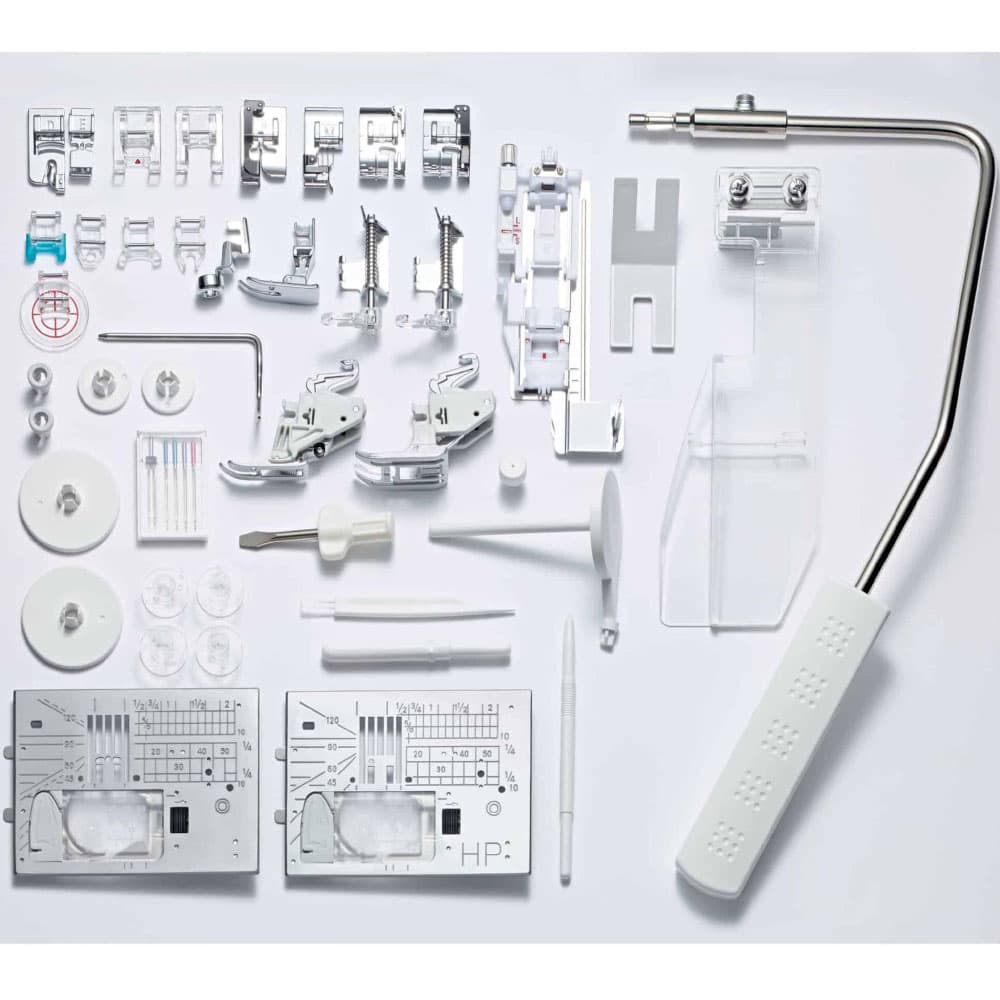 Zig Zag Foot A, Overcasting Foot M, Satin Stitch Foot F, Blind Hemming Foot G, Zipper Foot E, 1/4" Seam Foot O, 1/4" Seam Foot O (w/o Guide), Automatic Buttonhole Foot, Stabilizer Plate, Rolled Hem Foot D, Open-Toe Satin Stitch Foot F2, Darning Foot PD-H, Open-Toe Darning Foot PD-H, Professional Grade Foot HP, Closed-Toe Free Motion Quilting Foot QC, Open-Toe Free Motion Quilting Zig Zag Foot QO, Free-Motion Quilting Zig Zag Foot QV, Open-Toe Variable Zig Zag Foot QZ, Ruler Work Foot QR, Button Sewing Foot T, Button Shank Plate, Dual Feed Holder, Dual Feed Foot AD, Dual Feed Plus Professional Foot HP2, Accurate Stitch Regulator (A.S.R.) Case, Accrurate Stitch Regulator (A.S.R.), Accrurate Stitch Regulator (A.S.R.) Closed-Toe Foot ASR-QC, Accurate Stitch Regulator (A.S.R.) Open-Toe Foot ASR-QO, Accurate Stitch Regulator (A.S.R.) Clear-View Foot ASR-QV, Accurate Stitch Regulator (A.S.R.) Ruler Work Foot ASR-QR, Accurate Stitch Regulator (A.S.R.) Instruction Card, Bobbins, Needles, Lint Brush, Seam Ripper, Quilting Guide Bar, Screwdriver, 2 Large Spool Holders, 2 Small Spool Holders, 2 Special Spool Holders, Extra Spool Pin, Touch Pen Stylus, Needle Plate, Hook Cover Plate, Straight Stitch Needle Plate, Professional Grade Needle Plate, Hook Cover Plate HP, Accessory Case, Threading Guide Sticker, Dust Cover, Semi-hard Fabric Cover, Cloth Guide, Extra-Wide Table, Knee Lifter, Foot Control, Power Supply, Thread Cutter Switch, Instruction Manual, and QR Code for Instructional Video.