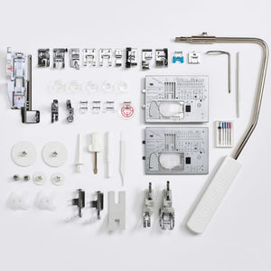 Zigzag Foot A, Overcasting Foot M, Satin Stitch Foot F, Blind Hemming Foot G, Zipper Foot E, Invisible Zipper Foot Z, Automatic Buttonhole Foot R, Stabilizer plate, Rolled Hem Foot D, Open Toe Satin Stitch Foot F2, Button Sewing Foot T, 1/4˝ Seam Foot O, 1/4˝ Seam Foot O (without guide), Professional Grade Foot HP, Darning Foot PD-H, Darning Foot (open-toe) PD-H, Dual Feed Foot AD (twin), Dual Feed Plus Foot HP2, Free Motion Quilting Closed-Toe Foot QC, Free Motion Quilting Open-Toe Foot QO, Free Motion Quilting Zigzag Foot QV, Variable Zigzag Open-Toe Foot QZ, Ruler Work Foot QR, Button shank plate, Bobbins, Needles, Lint Brush, Seam Ripper, Quilting Guide Bar, Screwdriver, Thread Nets, Large Spool Holders, Small Spool Holders, Special Spool Holders, Spool Rests, Knee Lifter, Touch Panel Stylus, Zigzag Needle Plate, Straight Stitch Needle Plate, Professional Grade Needle Plate HP, Extension Table, Semi-hard Fabric Cover, Accessory Box, PC Application Pack, Power Cable, Foot Control, Thread cutter switch, and an Instruction Book.