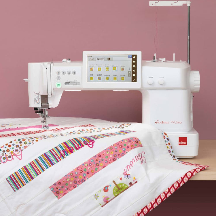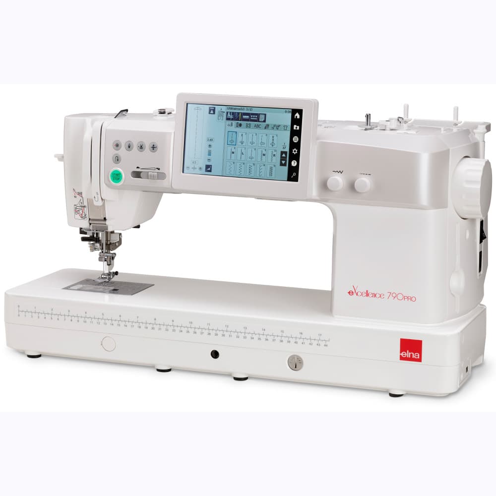 The Elna eXcellence 790PRO Semi-Professional Computerized Sewing Machine has impressive space, tremendous power, and infinite technical and creative potential. Meeting the highest expectations of sewists and quilters, this machine features a flat-bed design with a full aluminum body, an extra-large sewing area, a 7" HD color touch screen, 1300 stitches per minute, nine high-illuminance LED lighting in 4 locations, Superior System needle threader, bobbin thread sensor, state-of-the-art 7-piece feed dog, Advanced Dual Feed and Dual Feed Plus system, one-step needle-plate conversion, 3 MB integrated memory, and an extra-large extension table with built-in accessory storage! Equipped with 400 stitch patterns, 12 one-step automatic buttonholes, three alphabet fonts, and pattern combos up to 100 stitches, the Elna eXcellence 790PRO provides a new innovative, reenergized sewing experience!