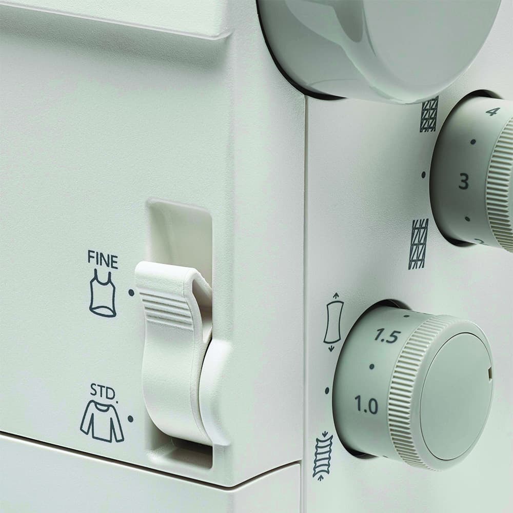 Even with stretchy fabrics like knits and georgette, you can easily create professional-level finishes by adjusting the differential feed. This feature allows you to fine-tune how the material is fed through your machine and helps to prevent puckering or distorting. It works by making the front and rear feed dogs move at different speeds. Set the dial to 1.0 for regular sewing, lower numbers for fine fabrics, and higher numbers on stretchy fabrics.