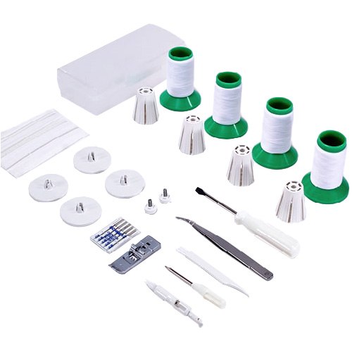 Accessory Box, (4) White Thread Cones, (4) Spool Holder Cones, (4) Large Spool Holders, (4) Thread Nets, Small Screwdriver, Medium Screwdriver, Tweezers, Needle Threader, Lint Brush, (2) Fixing Screws for Optional Attachments, Needles, Machine Dust Cover, Foot Control, and the Instruction Manual.