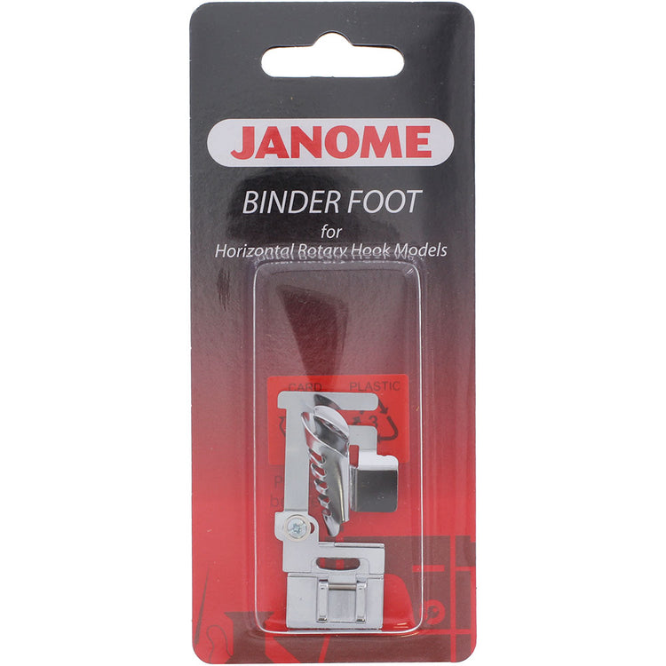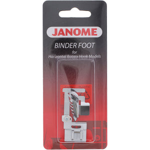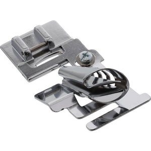 The binder foot is used to apply pre-folded bias binding tape or bias tape you have cut yourself to the edge of fabric in one easy step. It is equipped with a small funnel to fold and guide the binding over the fabric edge before it reaches the needle and can be used with either zigzag or decorative stitches as well as straight stitch. 10 mm to 14 mm bias tape can be used.