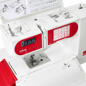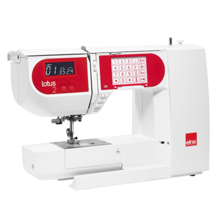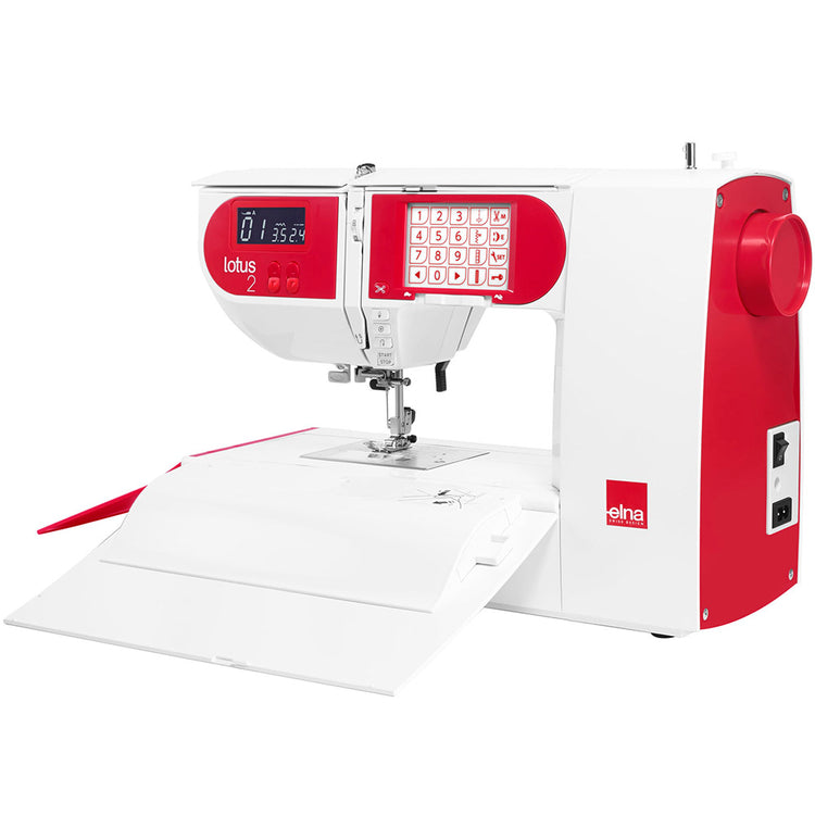 Meet the all-in-one computerized sewing machine - The Elna Lotus 2! Staying true to the original Lotus models' inventive concept and nature, the Lotus 2 blends comfort, simplicity, and functionality together in a user-friendly machine. The innovative "carrying case" design makes traveling with the Lotus 2 easier than ever. The folding flaps flower open with the push of a lever, creating a perfect, spacious, built-in sewing table! With features like one-touch buttons, a built-in needle threader with an automatic thread cutter, an integrated spool pin for permanent threading, a centralized needle bar, 100 built-in stitches, and an LCD screen, the Lotus 2 is the total package. Celebrating the 50th anniversary of the legendary Lotus, Elna presents the Lotus 2, featuring a vaster selection of stitches and a snazzy Elna-red finish!