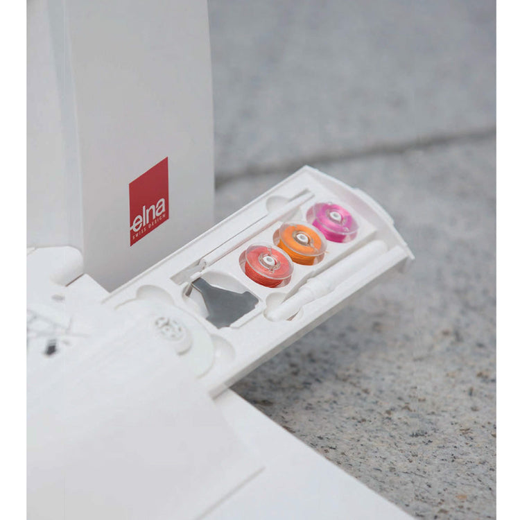 The Lotus 2 comes with accessory storage on top and an accessory drawer on the bottom, giving a home to all your main essentials. Open the top cover to access storage for needles, presser feet, buttonhole feet, instruction chart, etc. Slide open the pull tab on the bottom flap to reveal an accessory drawer for easy access items like bobbins, a lint brush, a spool holder, a screwdriver, and a seam ripper.