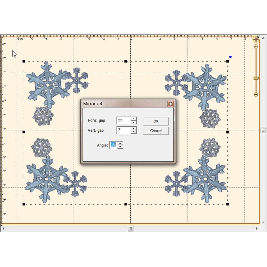 Mirror your design 4X to create easy corner designs. Perfectly set corner designs in all four corners of the hoop to your determined measurements.