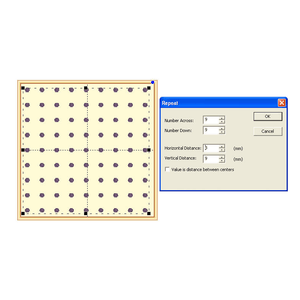 Create tiled patterns by repeating designs in a grid set to a number of repeats and spacing, with additional controls to stagger, flip, and mirror designs.