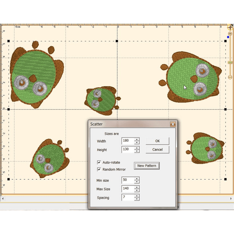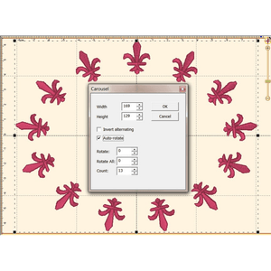 Easily create a randomized pattern for all-over embroidery. Specify the width and height of the area and choose whether the design can be rotated or mirrored at random.