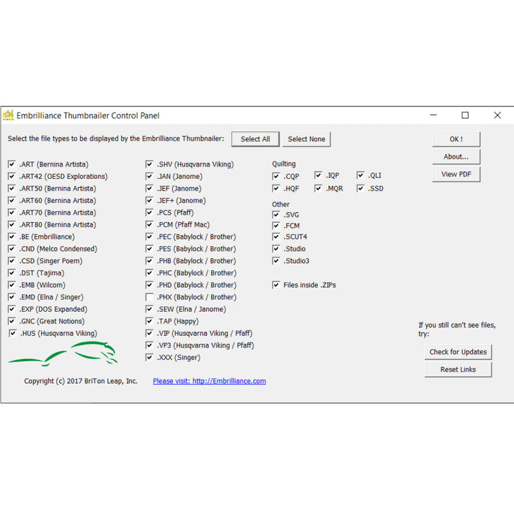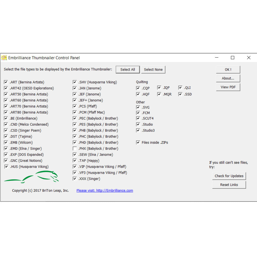 The Embrilliance Thumbnailer Software is a must-have organizational tool for the avid embroiderer. Those of us with an extensive library of embroidery designs understand the frustration of wading through each design to find the specific one you're looking for. The Embrilliance Thumbnailer adds a thumbnail image to each embroidery design or cutting design and can even display file type, size, and name, as well as the date created, modified, and last opened. For your convenience, thumbnails can be viewed as small, medium, large, and extra-large icons. The Thumbnailer Software is compatible with both MAC OSX 10.5 and up as well as Windows XP, Vista 7, 8, 8.1, and 10, and there is no limit to the number of times you can install it!