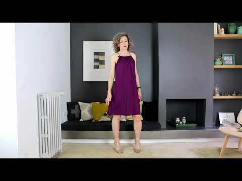 The Enmore Halter Dress & Top is a halter-neck sundress that features narrow straps, a built-in bra, and pockets. The shelf bra includes cup sizes to help you get a great fit. This style can be cut on grain or on the bias if you want more drape to the fabric. View B is a shorter, blouse-length version of the dress. The pattern includes sizes ranging from 0 to 20 and works best with lightweight semi-drapey or drapey woven fabrics like cotton poplin, linen, rayon, lawn, voile, or silk satin.