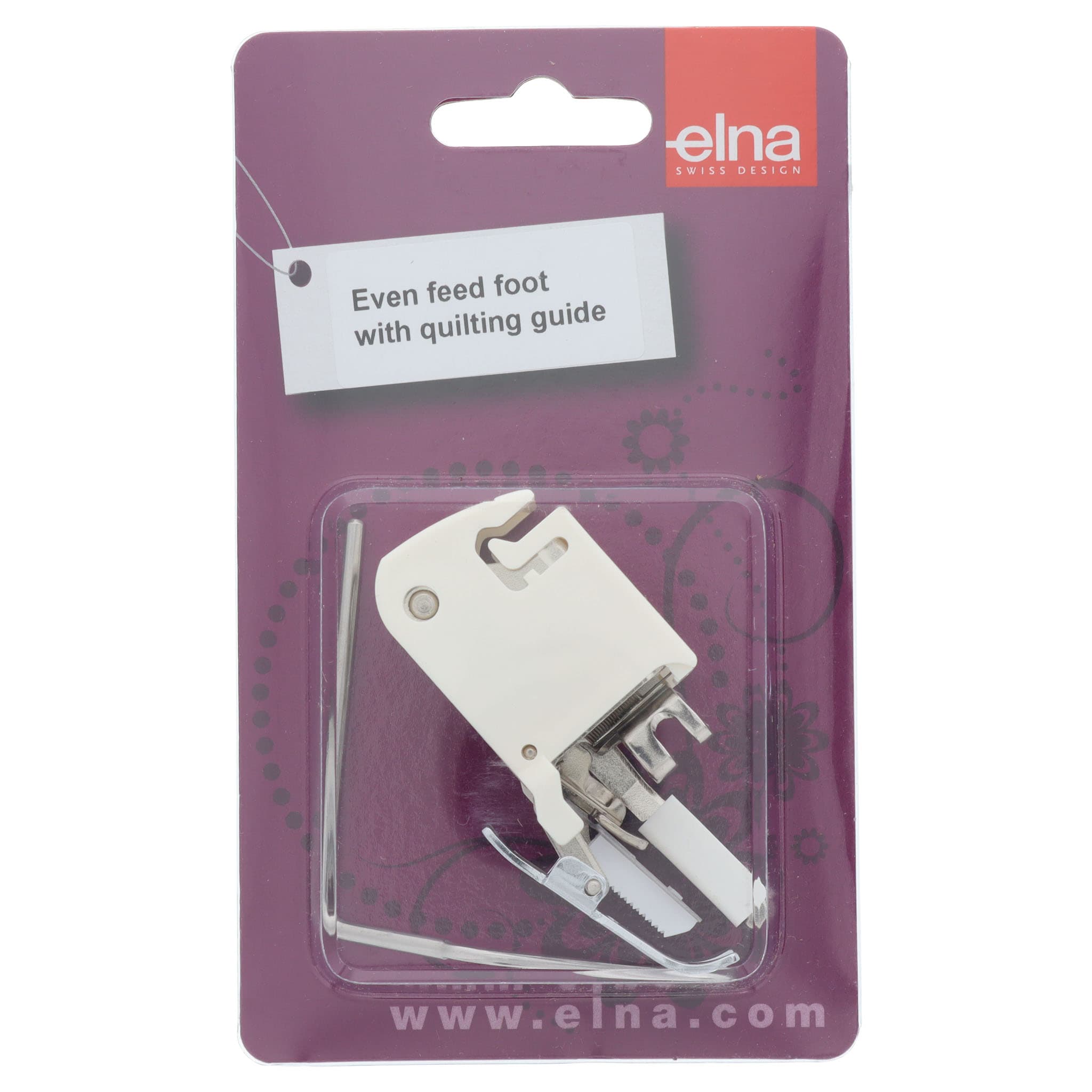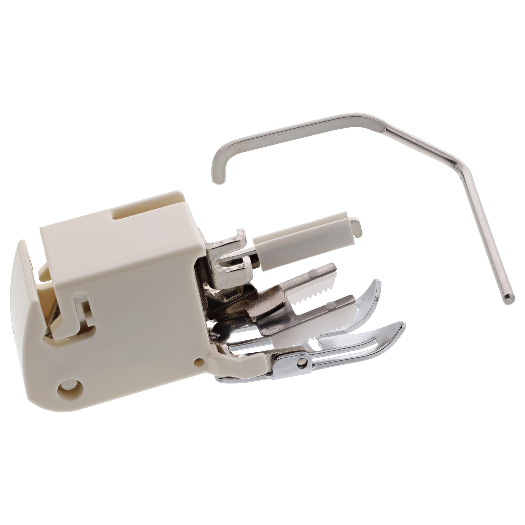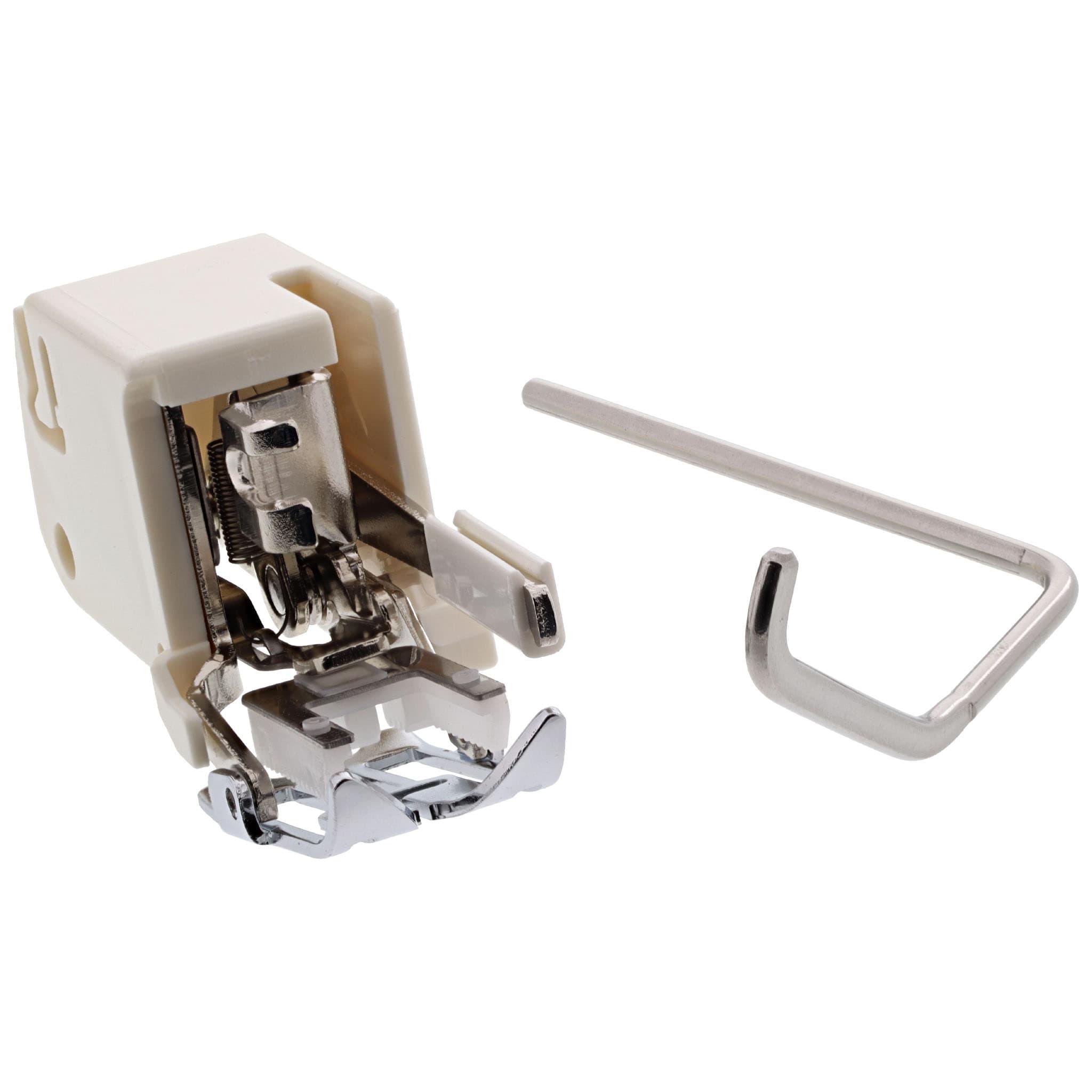 The Even Feed Foot w/ Guide is great for keeping quilt layers from moving around when sewing and keeping matching stripes and checks. The fabric lays between an upper and lower feed dog to move the fabric simultaneously, preventing it from slipping. This Even Feed Foot comes with an adjustable quilting guide bar.