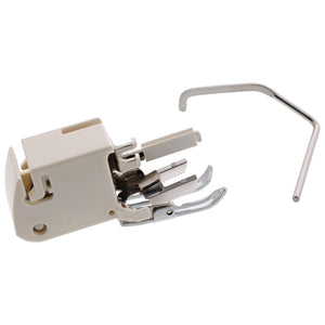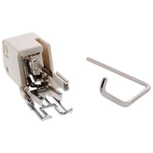 The Even Feed foot is an excellent tool for keeping quilt layers from shifting and moving. It can also be helpful when sewing stripes and checks, keeping them lined up and straight. The fabric lays between an upper and lower feed dog to move fabrics simultaneously, helping them from slipping. This Even Feed foot also comes with an adjustable quilting guide bar.