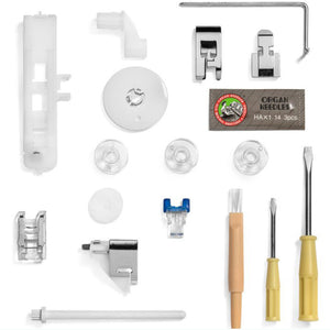 All Purpose Foot, Zipper Foot, Buttonhole Foot, Overcasting Foot, Blindhem Foot, Satin Stitch Foot, Button Sewing Foot, Lint Brush/Seam Ripper, Spool Holder, Edge Quilting Guide, Bobbins, Large Screwdriver, Small Screwdriver, Needles, Spool Pin Felt, Auxillary Spool Pin, 9.5" by 13" Extension Table, Soft Cover, Power Cord, Foot Control, Soft Cover, and Instruction Manual.