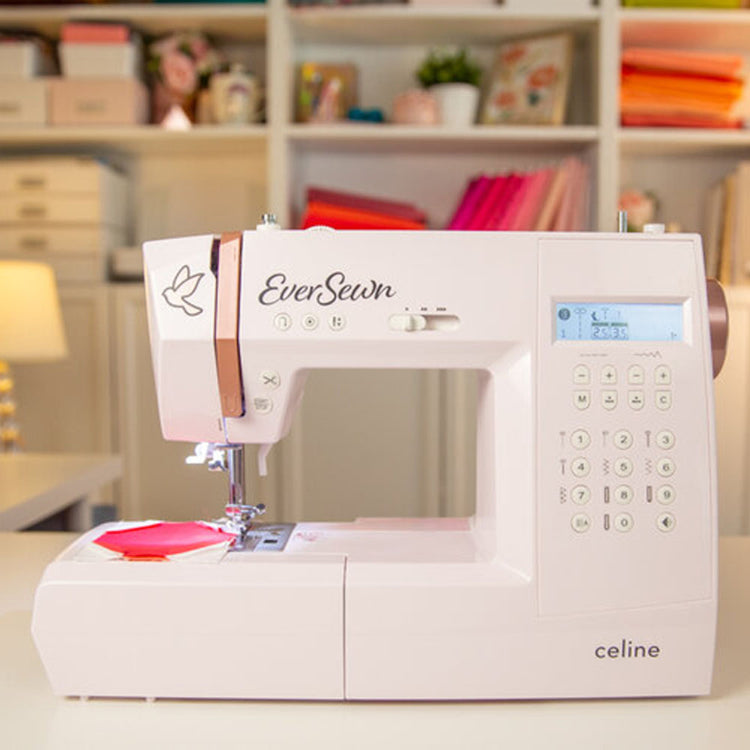 The EverSewn Celine Computerized Sewing Machine offers everything a visionary sewist could crave. Featuring 197 built-in stitches, including 26 utility, 72 decorative, and one full alphabet in block style, with the ability to save stitch combinations into the memory function, six convenient one-touch buttons, an auto needle threader, drop feed, a max sewing speed of 850 stitches per minute, a 6-inch throat space and an included extension table! The EverSewn Celine is precision engineered with metal parts, yet still under 15 lbs, making this machine durable but ideal for travel or toting to quilt classes! The DC 24V motor makes sewing over multiple layers of denim an easy task with flawless stitch quality thanks to the easy load drop-in bobbin.