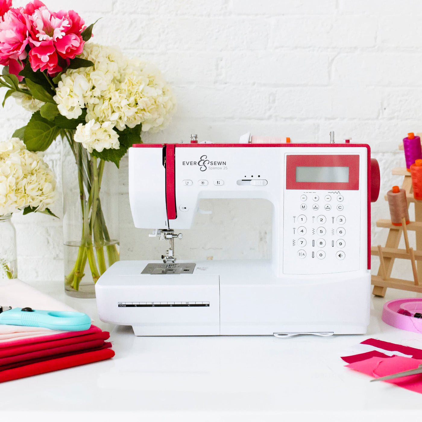 The EverSewn Sparrow 25 is a computerized sewing machine with an array of luxury features at an affordable price. Features include 197 built-in sewing, utility, and decorative stitches, 7 one-step buttonhole options, and a drop feed. Sew at speeds of 850 stitches in just 60 seconds with the EverSewn Sparrow 25. Use the start/stop button to sew on autopilot (without a foot control)! Personalize every project with the built-in alphabet font, which includes upper and lower case letters, accents, and punctuation. The needle up/down button allows you to set your needle in your desired position. This lightweight machine comes with seven (7) presser feet that can be stored in the removable auxiliary bed along with other accessories. Take your EverSewn Sparrow 25 with you to sewing classes, guild meetings, and vacations!
