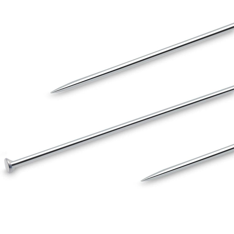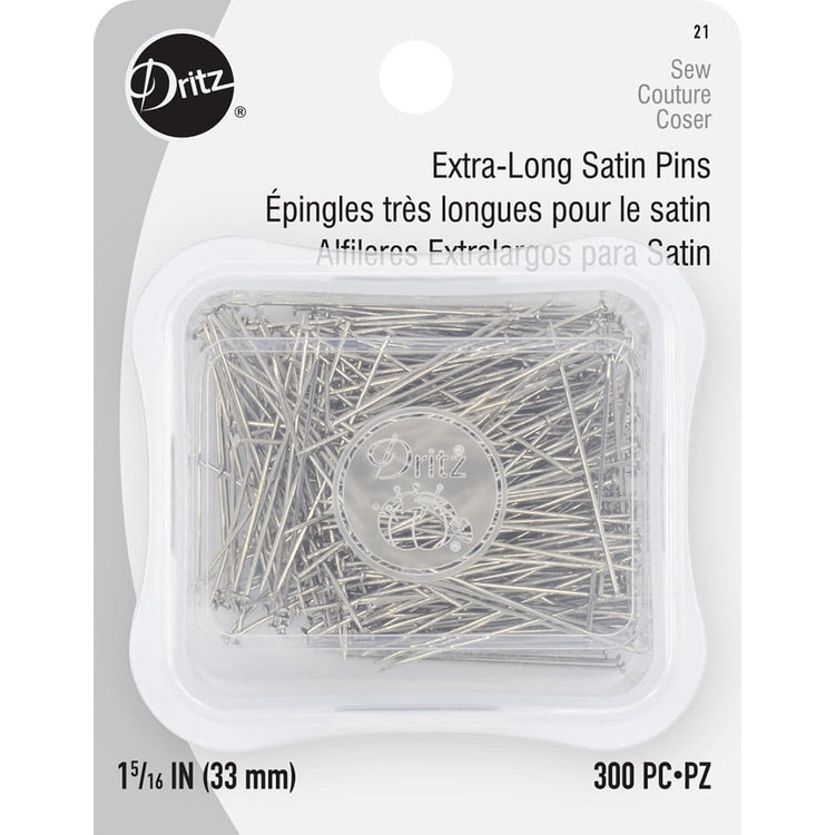 Dritz Extra-Long Satin Pins are used for satin and light to medium weight fabrics. These pins are made of nickel-plated steel and are used for satin and medium-weight materials. They have a sharp, tapered point which allows them to pierce fabric easily. Each pin measures 1-5/16" long and comes in a reusable plastic case. Case contains 300 Extra-Long Sating Pins.