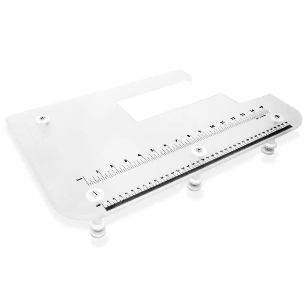 Janome's Extra Wide Table measures 19-1/2" long by 12" wide. Please note the table may vary slightly from the picture.