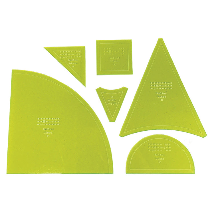 The Roller Disco Template Ruler Set is the ultimate collection of rulers for curved piecing. Circles, half-circles, triangles, diamonds, and squares are just a few of the shapes you can create with this six-piece set. Each ruler is built using heavy grade plastic that resists chipping and breaking.