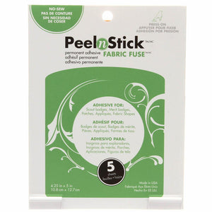 Fabric Fuse Peel 'N Stick Sheets work great with patches, felt, applique, and ribbon. This permanent, no-sew, double-sided adhesive is easy to use. Simply press it to your materials, apply pressure, and you are ready to go; no sewing or ironing required! Peel 'N Stick Sheets are machine washable, but not dry cleanable. Fabric Fuse Peel 'N Stick Sheets come five to a pack and measure 4-1/4" by 5". Made in the USA.